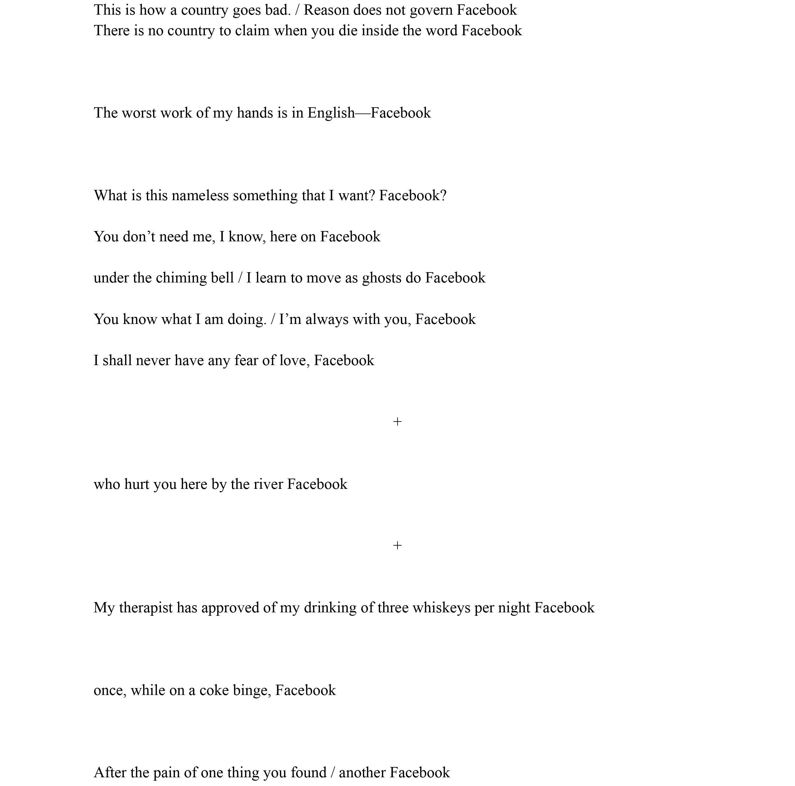 First Lines for the Death of Facebook David John‘s work has recently appeared in Hotel Amerika, Conduit, Always Crashing and elsewhere. He lives in Virginia.